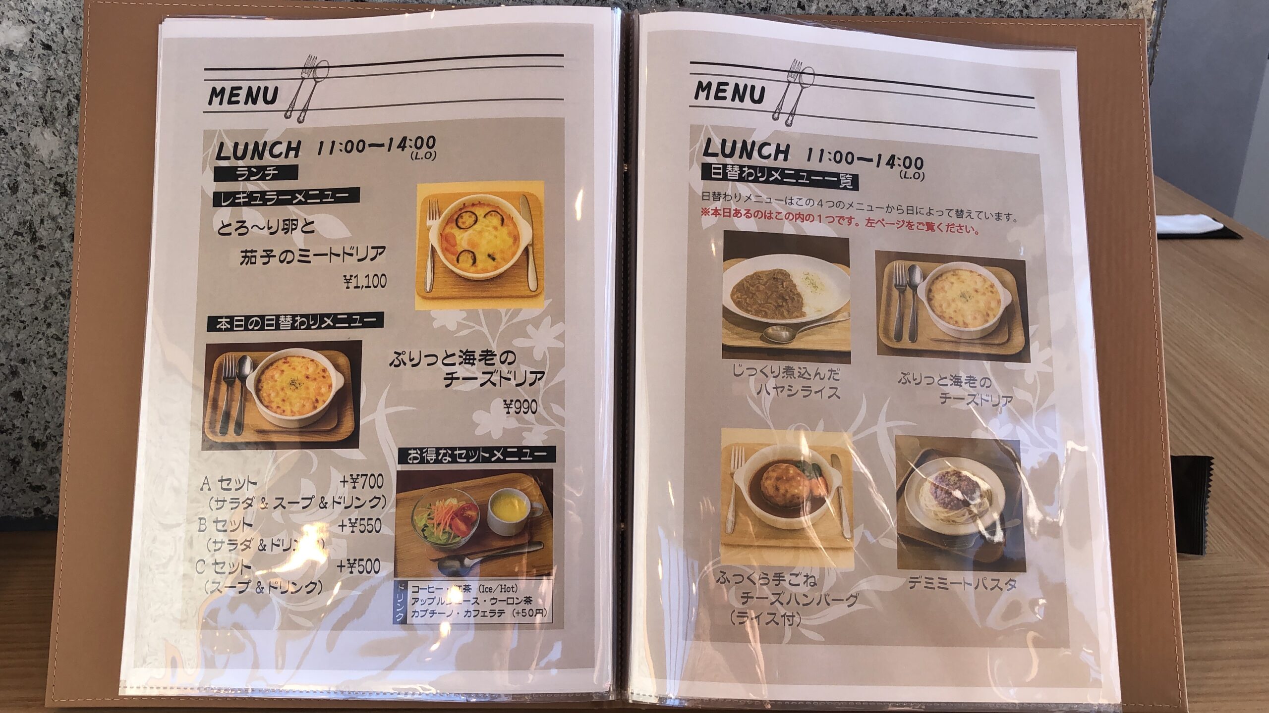ドリアやハンバーグなどのフードメニューはもちろん、日替わりランチや軽食、スイーツもあります。